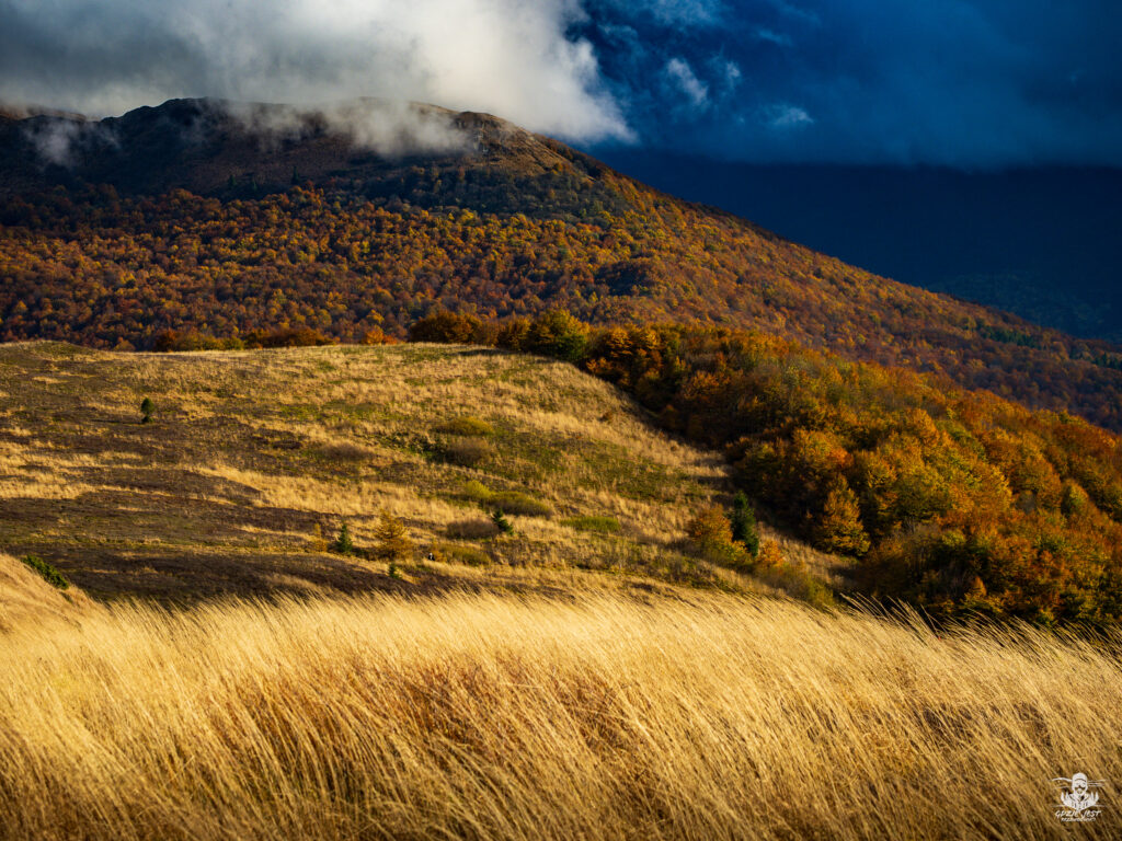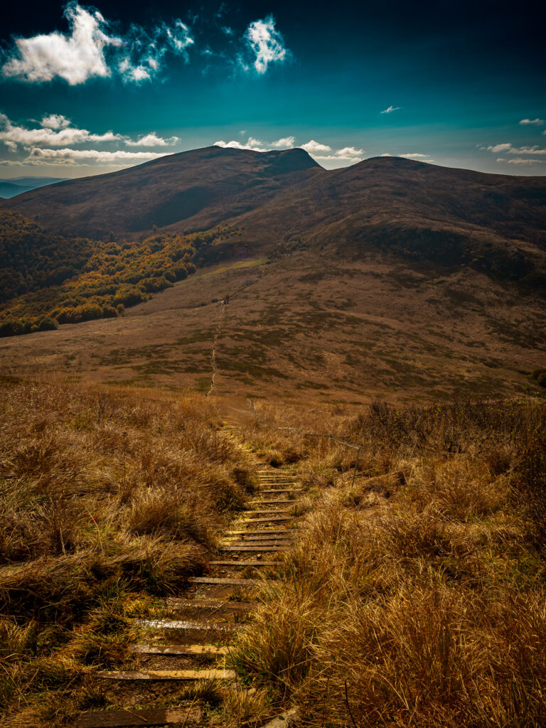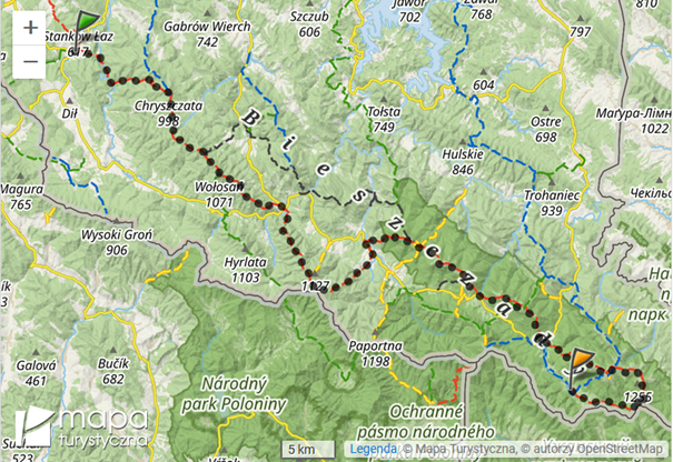 Komańcza – Przełom Osławy – Jeziorka Duszatyńskie – Chryszczata – Wołosań – Bacówka PTTK Pod Honem – Cisna – Małe Jasło – Duże Jasło – Okrąglik – Fereczata – Smerek (wieś) – Smerek (szczyt) – Roh – Hasiakowa Skała – Brzegi Górne – Połonina Caryńska – Ustrzyki Górne – Szeroki Wierch – Tarnica – Przełęcz Goprowska – Halicz – Rozsypaniec – Przełęcz Bukowska – Wołosate