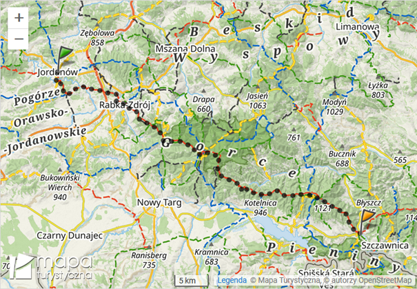 Jordanów – Wysoka – Skawa – Rabka ZdrójSchronisko PTTK na Maciejowej – Stare Wierchy – Obidowiec – Turbacz – Przełęcz Knurowska – StudzionkiLubańKrościenko nad Dunajcem